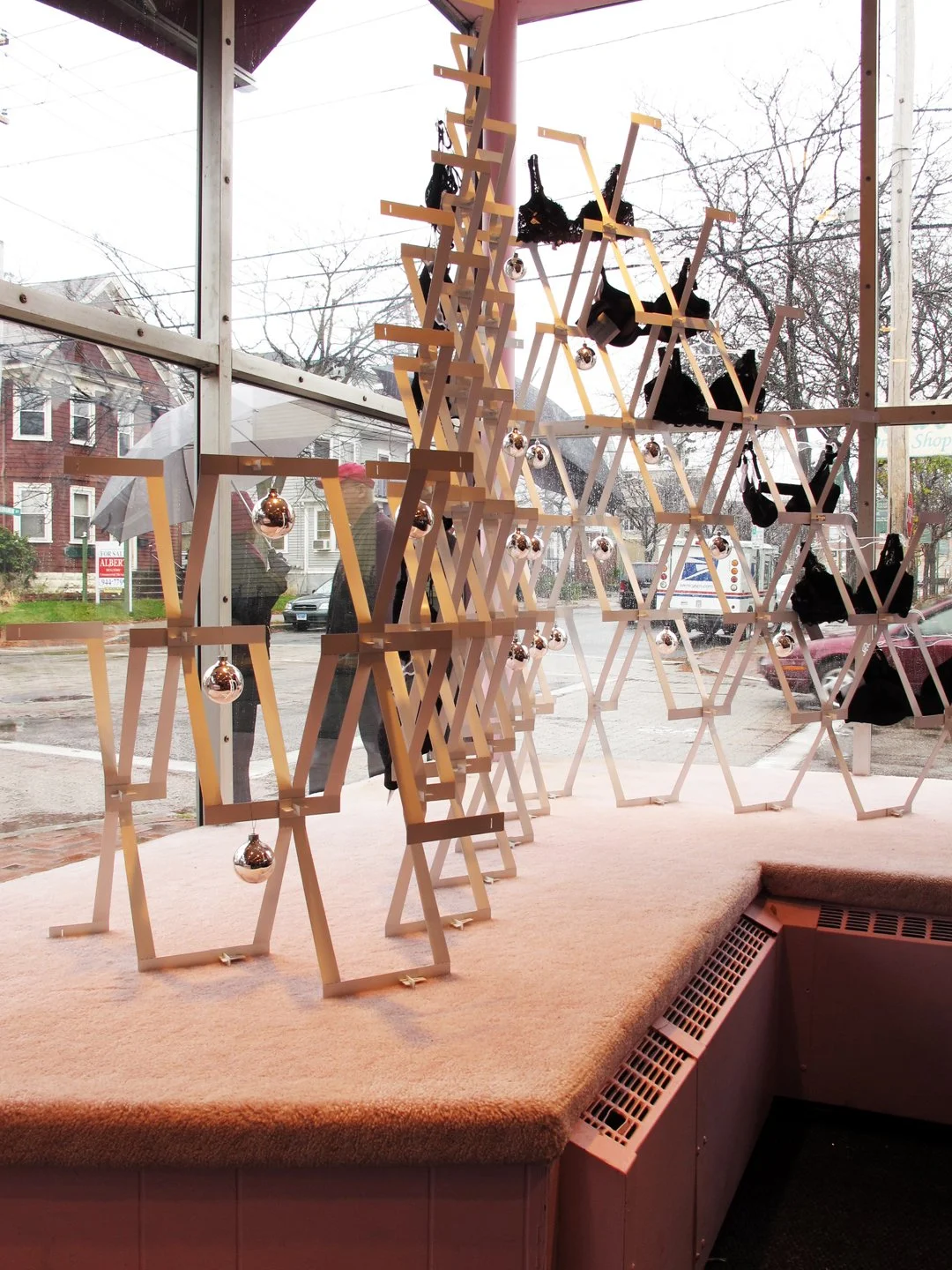 In partnership with Artists’ Exchange and RISD, each store along Rolfe Square commissioned a unique holiday window installation to celebrate the winter holidays. Located in Cranston, Rhode Island, this store has been lovingly serving its community for over half a century. Ruth’s Lingerie at 44 Rolfe Sq sat at the corner of Rolfe Sq. and Auburn Street with triple the number of windows and storefront footprint compared to all the other stores on Rolfe Sq., tasking the team with a fun challenge to design on a simple budget.