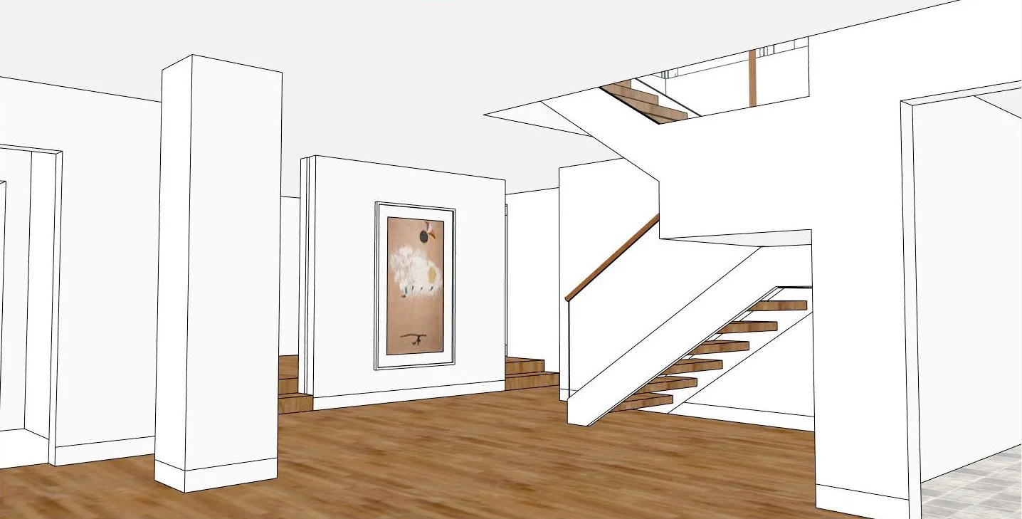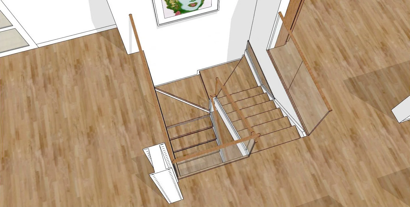 The owners of the penthouse of this UES building wanted to combine the two units below to form a triplex. At the heart of the overall renovation would be the staircase — a major structural undertaking. Through a series of iterations and design proposals, this staircase evolved into a beautifully crafted centerpiece.