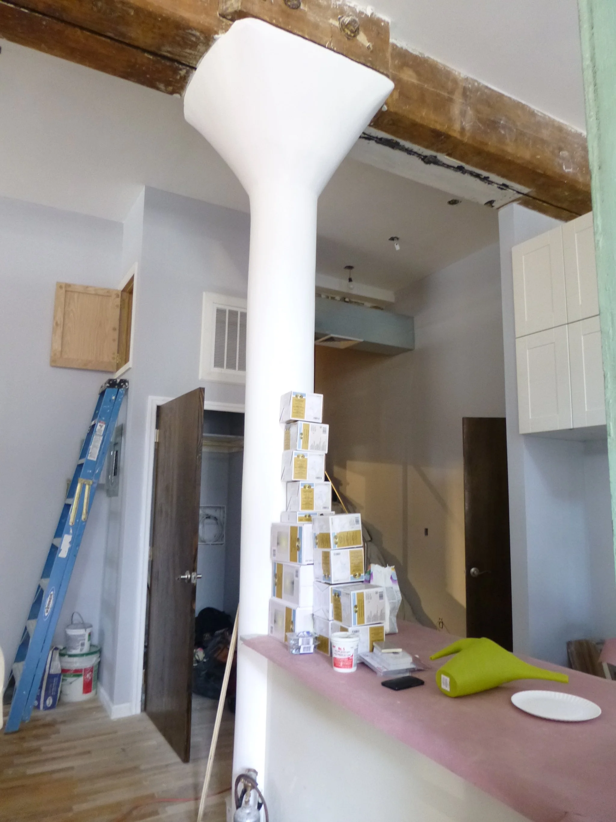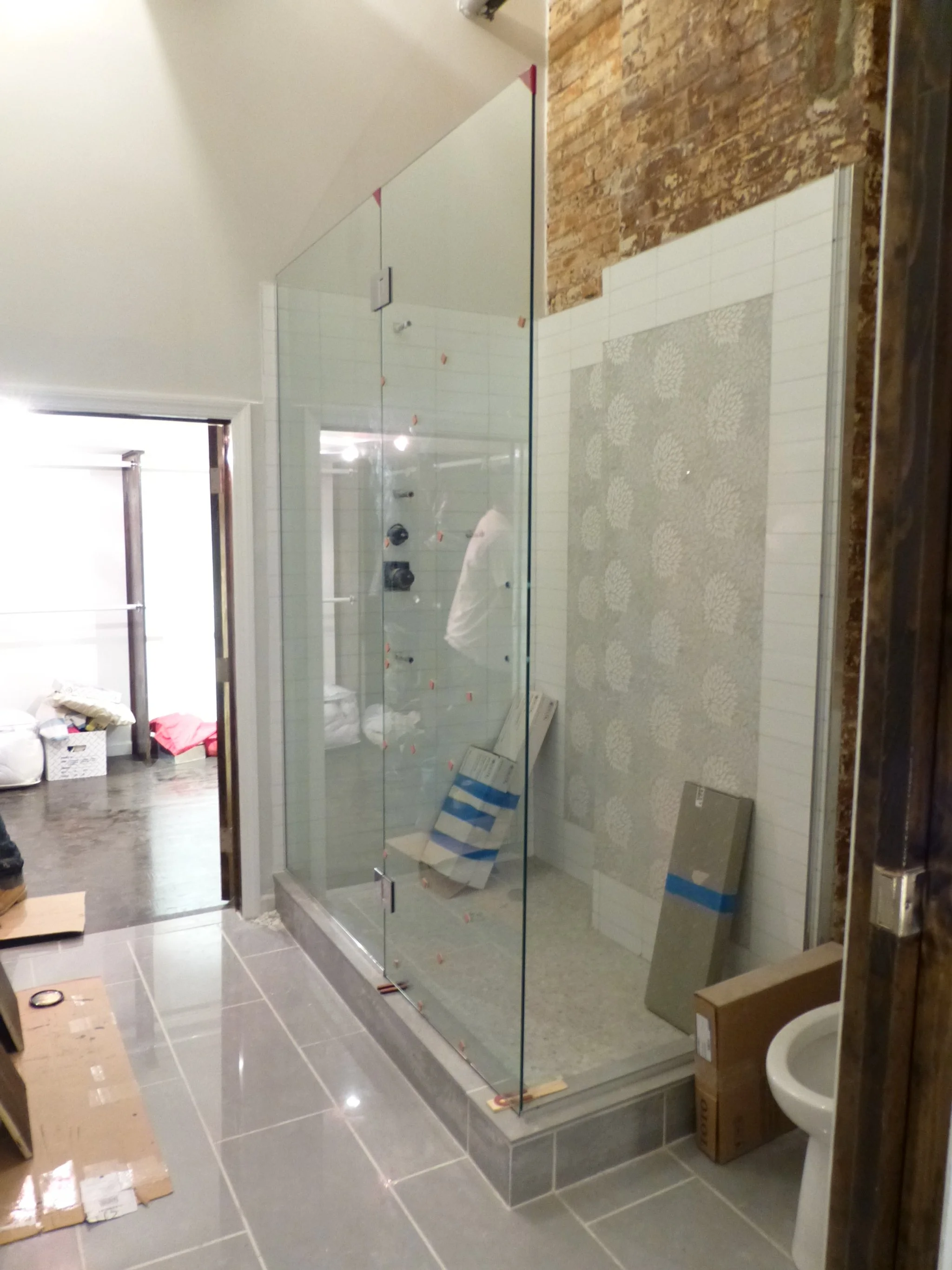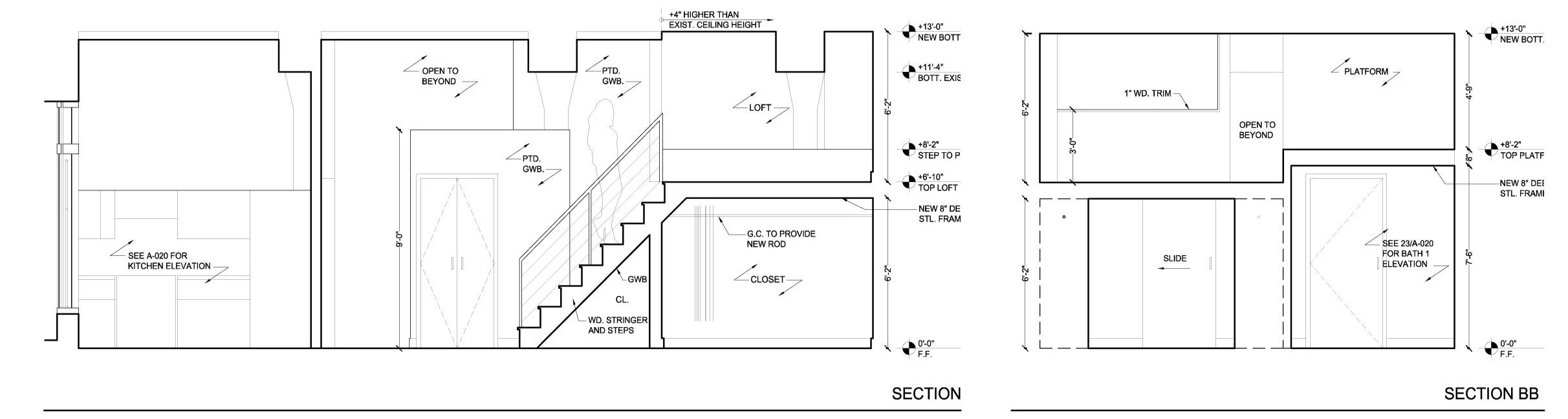 This northern Tribeca corner loft features 13 foot ceilings and unique existing details like wood beam ceilings, full-height arch windows, and exposed brick walls. This full gut renovation transformed the loft into a proper one-bedroom apartment with two full baths.